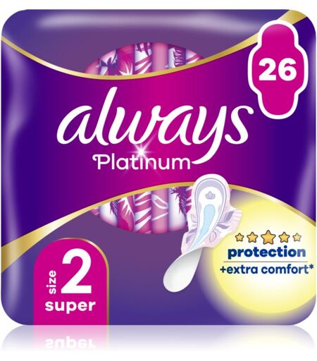 Always Platinum Super Size 2, 26 kpl, Terveyssiteet Naisille, Maksimaallinen mukavuus ja 100-prosenttinen suoja kuukautiskierron aikana. Terveyssiteet Always Platinum Super Size 2 varmistavat mukavan ja varman tunteen vuotopäiviesi aikana. Ominaisuudet: siivet suojaavat alusvaatteiden reunoja koko on ihanteellinen keskirunsaan vuodon päiviin imukykyinen sisus, joka imee ja lukitsee nesteen sisäänsä ...