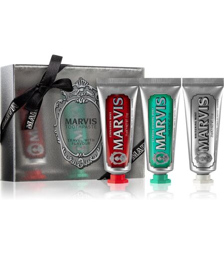 Marvis Flavour Collection Classic, , Täydellinen suoja unisex, Hammastahna Marvis Flavour Collection Classic hoitaa kokonaisvaltaisesti hampaita ja ikeniä. Tahna poistaa hampaista plakin ja ruoan jäänteet ja hoitaa samalla ikeniä ja suuontelon limakalvoa. Setin sisältö: Cinnamon-Mint hammastahna 25 ml Mint hammastahna 25 ml hammastahna valkaiseva vaikutus 25 ml Ominaisuudet: estää hammaskiven kertymistä vähentää plakin muodostumista hoitaa ikeniä puhdistaa hampaita tehokkaasti Käyttöohjeet: Levitä sopiva määrä tahnaa hammasharjalle ja pese hampaita ainakin 2 minuutin ajan. Huuhtele suuontelo huolellisesti. Pese hampaat ainakin 2x päivässä laadukkaalla hammasharjalla. ...