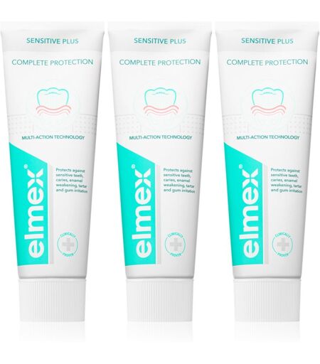 Elmex Sensitive Plus Complete Protection, 3x75 ml, Täydellinen suoja unisex, Hammastahna Elmex Sensitive Plus Complete Protection hoitaa kokonaisvaltaisesti hampaita ja ikeniä. Tahna poistaa hampaista plakin ja ruoan jäänteet ja hoitaa samalla ikeniä ja suuontelon limakalvoa. Ominaisuudet: puhdistaa hampaita tehokkaasti hoitaa ikeniä vähentää plakin muodostumista estää hammaskiven kertymistä Käyttöohjeet: Pese hampaat ainakin 2x päivässä laadukkaalla hammasharjalla. ...