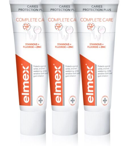 Elmex Caries Protection Complete Care, 3x75 ml, Täydellinen suoja unisex, Hammastahna Elmex Caries Protection Complete Care hoitaa kokonaisvaltaisesti hampaita ja ikeniä. Tahna poistaa hampaista plakin ja ruoan jäänteet ja hoitaa samalla ikeniä ja suuontelon limakalvoa. Ominaisuudet: puhdistaa hampaita tehokkaasti hoitaa ikeniä vähentää plakin muodostumista estää hammaskiven kertymistä Käyttöohjeet: Levitä sopiva määrä tahnaa hammasharjalle ja pese hampaita ainakin 2 minuutin ajan. ...