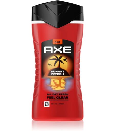 Axe Sunset Fresh, 250 ml, Suihkugeelit ja saippuat Miehille, Suihkugeeli Axe Sunset Fresh tekee välttämättömästä päivittäisestä hygieniasta ainutlaatuisen virkistävän elämyksen.  Ominaisuudet:  pesee hellävaraisesti koko vartalon ihon sopii vartalolle ja hiuksille pehmentää ja kosteuttaa antaa raikkaan ja energisen tunteen jättää ihon samettisen pehmeäksi ja sileäksi  Käyttöohjeet: Levitä tuotetta kostealle iholle ja pese kaikki epäpuhtaudet pois. Huuhtele huolellisesti. ...