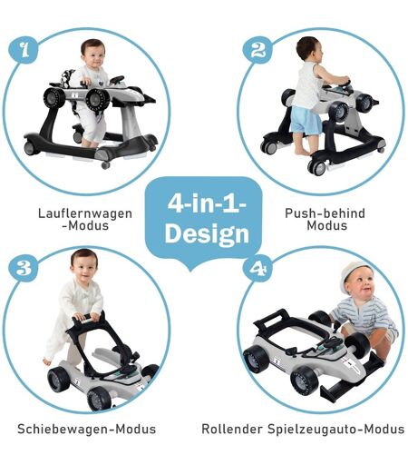 Tutustu monipuoliseen 4-in-1 Baby Walkeriin: turvallisuus, mukavuus ja hauskanpito yhdistettynä 4-in-1 Baby Walker on täydellinen kumppani lapsellesi, ja se on suunniteltu mukautumaan hänen kasvaviin tarpeisiinsa varmistaen samalla maksimaalisen turvallisuuden ja mukavuuden. Tämä innovatiivinen kävelijä sopii 6–18 kuukauden ikäisille lapsille, ja siinä on valikoima ominaisuuksia, jotka tekevät siitä erottuvan valinnan vanhemmille. Säädettävällä korkeus- ja nopeusasetuksella tämä kävelijä vastaa lapsesi yksilöllisiin tarpeisiin ja edistää sekä itsenäisyyttä että kehitystä. 4-in-1-suunnittelu erilaisiin tarpeisiin Säädettävä korkeus ja nopeus yksilölliseen käyttöön Parannettu turvallisuus niskatuen ja luistamattomien askelmien ansiosta Vuorovaikutteiset ominaisuudet musiikilla ja valoilla Tilaasäästävä taitettava muotoilu Turvallisuus on ykkösprioriteettimme, minkä vuoksi tämä kävelytuoli on varustettu niskatuella, joka suojaa lapsesi päätä, sekä viidellä luistamattomalla askelmalla ja neljällä luistamattomalla pyörällä vakauden takaamiseksi. Istuin on pehmustettu pehmeällä vaahdolla ja siinä on ergonominen selkänoja, joka takaa käyttömukavuuden. Interaktiivinen muotoilu sisältää ohjauspyörän, vaihteet, kaksi valopainiketta ja kaksi peiliä, joten se muistuttaa minikilpa-autoa. Lisäksi musiikkia voi toistaa lapsesi viihdyttämiseksi, sillä se vaatii vain kaksi AA-paristoa (eivät sisälly). Kävelijän korkeutta voidaan säätää kolmelle eri tasolle lapsesi kasvun mukaan. Nopeutta voidaan myös säätää kahdella takapyörällä, mikä mahdollistaa räätälöidyn kokemuksen. Kun kävelijä ei ole käytössä, se voidaan helposti taittaa kokoon ja säilyttää seinää vasten tai sängyn tai sohvan alle kompaktin rakenteensa ansiosta. Irrotettava istuintyyny ei ole vain mukava, vaan myös helppo puhdistaa, mikä takaa hygienian ja mukavuuden kiireisille vanhemmille. Väri: harmaa Materiaali: PP, polyesteri, vaahto Kokonaismitat: 73 x 61 x 51,5/53,5/55,5 cm (P x L x K) Mitat taitettuna: 73 x 61 x 29 cm (P x L x K) Nettopaino: 4,5 kg Painokapasiteetti: 15 kg Suositeltu ikä: 6–18 kuukautta Paristot: 2 AA-paristoa (eivät sisälly) Yksityiskohtaisten ja helposti seurattavien ohjeiden ansiosta 4-in-1 Baby Walkerin kokoaminen on helppoa. Tämä tuote ei ainoastaan tue lapsesi ensimmäisiä askeleita, vaan myös rohkaisee hänen itsenäisyyttään ja uteliaisuuttaan leikin kautta. Sen harkittu muotoilu ja käytännölliset ominaisuudet tekevät siitä olennaisen lisäyksen jokaiseen kotitalouteen, jossa on pieni lapsi. ...