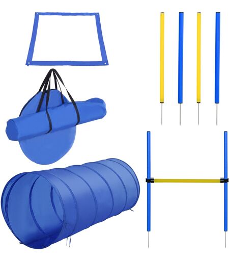Koiran Agilityharjoitusvälineet, Koiran Agilitysetti, Koiran Agilityrata, Sis. Tunneli, Pujottelusauvat, Estesauvat, Lähtökenttä, Sininen + Keltainen