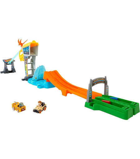 Kilpaile Jurassic World Islandilta pakoon tällä Hot Wheels RacerVerse -ratasarjalla, jossa on hiihtokilpailu ja maaliin köysirata. Setti sisältää painevaletut Blue Raptor- ja Owen-kilpailijat, joiden hahmot on asennettu painevalettujen Hot Wheels -autojen kuljettajan istuimiin, valmiina jännittävään kilpailuun. Nopein ratsastaja saavuttaa näkötornin ja nousee turvaan, kun taas vastustaja putoaa odottavan Mosasauruksen aukkoon. Setti voidaan taittaa kokoon säilytyksen helpottamiseksi. ...