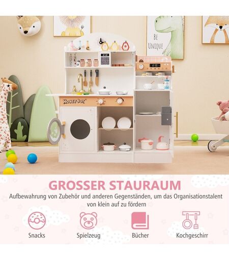 Lasten keittiö 27 tarvikkeella, puinen leikkikeittiö kellolla, mikroaaltouuni, valkoinen