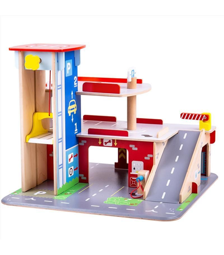 Parkkihalli – Tämä vilkas puinen autotalli on täynnä toimintaa jokaisessa kerroksessa! Toimiva hissi, joka nostaa autot parkkipaikalle, huoltokeskus, autopesula ja huoltoasema alakerrassa, tarjoavat paljon hauskaa pienille kuljettajille. Vivullinen ramppi antaa autoille nopean poistumisen, kun on aika lähteä kotiin. Yläosassa on myös helikopterikenttä, joten voit pysäköidä helikopterisi! Tämä värikäs parkkihalli rohkaisee luovaan ja mielikuvitukselliseen leikkiin. ...
