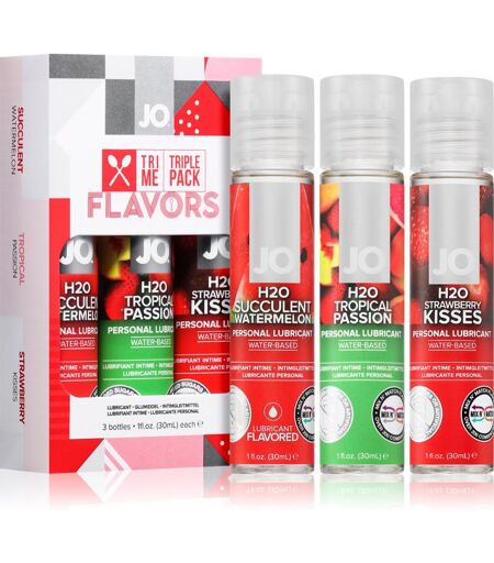 System JO Tri-Me Triple Pack Flavors, 3x30 ml, Erotiikkasetit unisex, Lisää seksin nautintoa lempimaullasi. System JO Tri-Me Triple Pack Flavors liukugeeli tuo lisämakua kaikkiin seksileikkeihin.  Setin sisältö:   System JO H2O Strawberry voitelugeeli maustettu 30 ml  System JO H2O Watermelon voitelugeeli maustettu 30 ml  System JO H2O Tropical voitelugeeli maustettu 30 ml  Ominaisuudet:  miellyttävä tuoksu ja maku huolehtii intiimialueen kosteuttamisesta ehkäisee hiertymien muodostumista voimistaa aistikokemusta intiimien hetkien aikana ei liimaudu eikä tahraa poistaa puutteellisesta liukastuksesta johtuvat epämiellyttävyydet silkkisen pehmeä rakenne  Ainesosat:  glyseriini vesi  Käyttöohjeet: Levitä iholle tarpeen mukaan. Voidaan käyttää samanaikaisesti seksivälineiden ja lateksista valmistettujen kondomien kanssa. ...