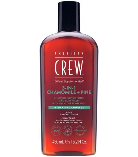 Runsaasti vaahtoava AMERICAN CREW 3-in-1 Kamomilla + Mänty -shampoo, hoitoaine ja suihkugeeli puhdistaa ja kosteuttaa sekä hiukset että vartalon, poistaa lian, hien ja viimeistelytuotteiden jäämät, tukee ja palauttaa ihon luonnollisen kosteustasapainon ja jättää ihon ja hiukset puhtaiksi, raikkaiksi ja pehmeiksi. ...