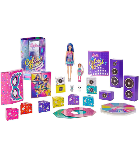 This Barbie Color Reveal set delivers the ultimate in unboxing experiences with more than 50 surprises, including a Barbie Color Reveal doll and Color Reveal Chelsea doll in a silvery metallic coating with colorful confetti stars, plus two Color Reveal pets in metallic pink and purple! Open the giftset to find a double-sided unboxing game and dance party-themed playmat. Play the game to unbox the 21 mystery boxes with surprises hidden inside, like fashions, hair accessories, party decorations and more. Once the boxes are opened, time to start the reveal fun. Remove the Barbie Color Reveal doll from the tube, fill the tube with warm water, then insert the doll and swirl her around. The water changes to a metallic silvery color with shimmery swirls, and when the doll is pulled out, her features are revealed! Repeat the process with Chelsea doll and the pet friends. And the surprises continueu2026dip the sponge in ice-cold water to activate the six color-change features! The packaging is part of the fun, too -- use the package pieces to create a DJ booth, party props and a puzzle. Use all of the pieces with the playmat to set up a dance floor for Barbie and Chelsea dolls to sing and dance the night away! Which dolls will you reveal? Kids can collect all the Color Reveal dolls to mix and match accessories and expand the possibilities! Each sold separately, subject to availability. Dolls cannot stand alone. Colors and decorations may vary.With more than 50 surprises in 1 package, the Barbie Color Reveal Holiday Set delivers all kinds of delight with Original Color Reveal Innovation -- kids will love the double-sided unboxing game and playmat, dance party-themed pieces and Color Revealu00ae Barbie and Chelsea dolls and 2 pets!Open the set and play the unboxing game to find 21 mystery boxes hiding Barbie and Chelsea dolls covered in metallic confetti star print, a pink metallic kitten, a purple metallic puppy, hair pieces, fashion accessories and party props like a Barbie-branded disco ball!To reveal the dolls and pets, fill the tube with warm water, place each confetti-covered doll and metallic pet inside (one at a time) and swirl them around -- the water changes to a festive, shimmery magical scene! ...