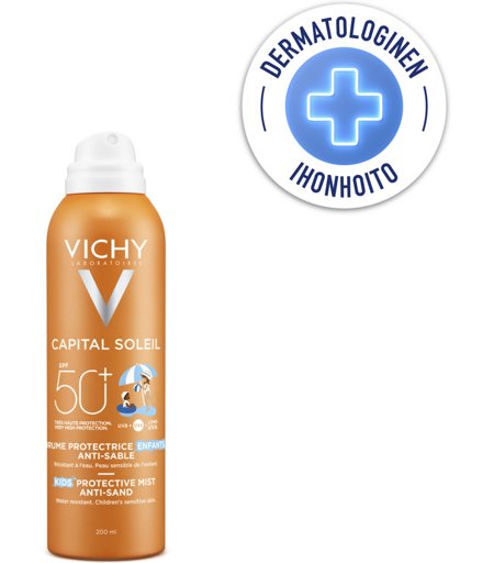 Aurinkosuojasuihke lapsille SPF50, joka estää hiekan tarttumista ihoon. ...