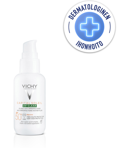 Vichy Capital Soleil UV-Clear SPF50 rasvoittuvalle ja akneen taipuvaiselle iholle. Käytä päivittäin suojaamaan ihoa UVA- ja UVB-säteitä vastaan sekä ehkäisemään ja vähentämään epäpuhtauksia, epäpuhtauksien jälkiä ja ihon kiiltelyä. Koostumus on kehitetty Netlock-teknologialla, joka tarjoaa laajaspektrisen UVA- ja UVB-suojan ja erittäin kevyen koostumuksen. Ei rasvoita eikä jätä valkoisia jälkiä. Mieto ja raikas tuoksu. Levitä aamuisin ihonhoitorutiinisi viimeisenä vaiheena. Ravista tuotetta hyvin ennen käyttöä.Tehokas laajakirjoinen suoja auringon säteiltä (UVA UVB-säteet) Kehitetty erityisesti rasvoittuvalle ja akneen taipuvaiselle iholle. Hillitsee ihon kiiltelyä koko päivän ajan. Kosteuttaa ihoa. Ei kuivata ihoa Erittäin kevyt koostumus. Imeytyy nopeasti. Ei jätä iholle rasvaista tai tahmaista tunnetta. Huomaamaton lopputulos. Jättää iholle mattapintaisen lopputuloksen. Vedenkestävä. Hienkestävä Ei tuki ihohuokosia. Sopiiherkälle ja aurinkoherkälle iholle. Sopii käytettäväksi ...