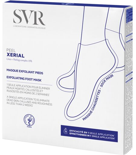 SVR Xerial -kuorivat sukkanaamiot sisältävät runsaasti keratolyyttisiä ja pehmentäviä aktiiviaineita, jotka kosteuttavat syvästi kuivia jalkoja ja poistavat kuollutta ihosolukkoa. Ainutlaatuisen imukyvyn ja vaikutuksen ansiosta kuorinta-aine vaikuttaa vain kyseiseen alueeseen ja suojaa samalla herkkää ihoa. Nopea ja radikaali vaikutus alle 2 viikossa. Hajusteeton, parabeeniton. Intensiivinen kuoriva kompleksi + urea 15 %: kuorii ja kosteuttaa intensiivisesti. Kosteuttava ja pehmentävä kasvikomp ...