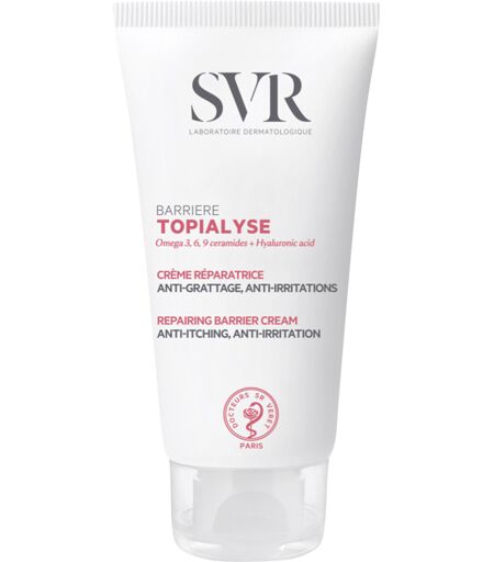SVR Topialyse Barrier Cream käsille, kasvoille ja vartalolle suojaa atooppista ihoa mekaanisilta tai kemiallisilta rasituksilta (pesuesteet jne.). Ärtyneet paikalliset alueet (kutina, stressi, päivittäiset ärsytykset) kasvoilla, iholaikut. Koostumuksen sisältämät Oomega 3,6,9 -seramidit ja hyaluronihappo palauttavat ihon luonnollisen suojakerroksen ja suojaavat sitä ulkoisilta stressitekijöiltä. Säätävät peptidit rauhoittavat ja niillä on ärsytystä ja kutinaa ehkäiseviä ominaisuuksia. Ei tahmea, ...