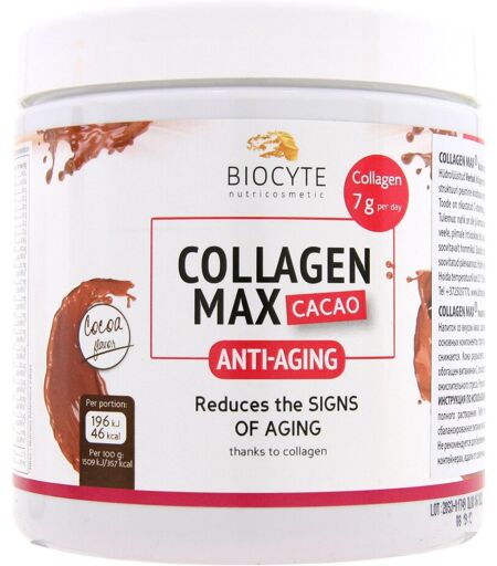 BIOCYTE Collagen Max Cacao on ikääntymistä ehkäisevä ravintolisä, joka on rikastettu kollageenilla ja hyaluronihapolla erittäin tiivistetyssä muodossa. Se on myös rikastettu C-vitamiinilla, joka edistää kollageenin normaalia muodostumista ihon normaalia toimintaa varten, ja E-vitamiinilla, joka auttaa suojaamaan soluja hapettumisstressiltä. Hydrolysoidulla kollageenilla on hyvin spesifinen aminogrammi, jonka ansiosta se voi suun kautta otettuna vaikuttaa syvällisesti ihon uudelleenmuodostukseen ...