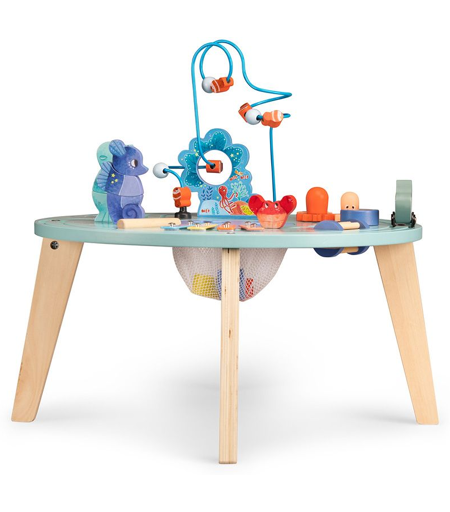 Hauska ja värikäs meriaiheinen leikkipöytä, jossa on paljon yllätyksiä ja aktiviteetteja tutkittavaksi! Silmukan ympäri klovnikalalla, pöydän ympärillä vierivän valaan kanssa, siksak-rapua, pesälaatikkoa, pinoavia eläimiä, mustekalapyörää ja merenneitoksylofoni. Pitää koota, asennus vaaditaan. ...