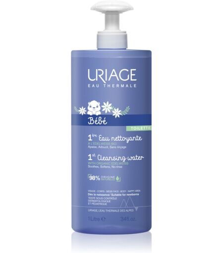 Uriage Bébé 1st Cleansing Water, 1000 ml, Lasten ihon puhdistus Lapsille, Tuote Uriage Bébé puhdistaa lasten vartaloa ja kasvoja hellävaraisesti.  Ominaisuudet:  hoitaa ihoa luotettavasti raikastaa kosteuttaa intensiivisesti  Käyttöohjeet: Levitä tarvittava määrä tuotetta ja puhdista iho. ...