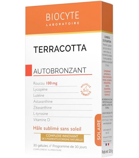BIOCYTE Terracotta Cocktail Self Tanner Itseruskettava itseruskettava kapseli sisältää neljän pigmentin ja kasviperäisten aineiden kompleksin, joka auttaa luomaan kauniin, tasaisen ja säteilevän ihonvärin ympäri vuoden ilman auringon säteilyä ja edistää tasaisempaa, nopeampaa ja intensiivisempää rusketusta rusketuksen aikana. Runsaasti beetakaroteenia sisältävät annaato eli värilliset marjakasvien siemenet, joilla on tulehdusta ehkäiseviä ja antibakteerisia ominaisuuksia, antavat kauniin ruskett ...