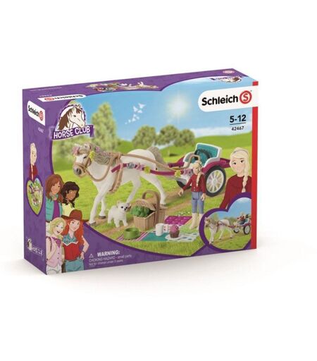 Lelusetti, jossa on hevoskärryt, hevonen, hahmot ja tarvikkeet Schleich Horse Clubilta. Aika lähteä retkelle, kiinnitä hevoskärryt hevoseen, pakkaa eväskori, aseta hahmo kärryihin ja lähde matkaan. Eväskori mahtuu kauniisti koristeltujen kärryjen taakse. Ehkä matka suuntautuu suureen hevosnäyttelyyn? Hevoskärryt ja valjaat voidaan irrottaa ja kiinnittää hevoseen (sopivat myös muihin Schleich-hevosiin). Sisältö: hevoskärryt, hevonen, tyttö, koira, koiranruokakuppi, omenoita, piknikkori, piknikviltti, kahvikuppi, lautanen ja leivonnainen. Mitat: kärry on 21x6,5x11 cm. Ikäsuositus 5-12 vuotta. Ei suositella alle 3-vuotiaille lapsille. ...