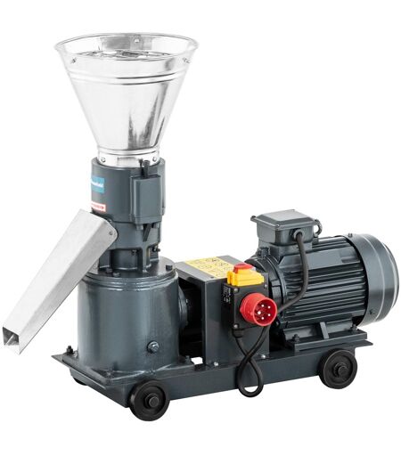 Wiesenfieldin tehokas pellettipuristin valmistaa rehupellettejä 100 kg/h tai käsittelee puuhaketta 60 kg/h. Raaka-aineiden yksittäisten hiukkasten tulee kuitenkin olla alle 6 mm:n kokoisia. Näin voit tuottaa suuria määriä rehu-, lannoitus- tai lämmityspellettejä helposti ja edullisesti. Valmistamalla rehupelletit itse, voit myös varmistaa, että ne sisältävät ainoastaan haluamiasi raaka-aineita. Pellettikone puristaa valitsemasi materiaalin suurella paineella halkaisijaltaan 120 mm suuren matriisin läpi. Huomattava paine ja pellettien kuumennus 60 - 80 °C:een saavat aikaan erityisen tiukasti puristettuja 6 mm:n kokoisia pellettejä. Kuumennus myös parantaa pellettien säilyvyyttä. Käytännöllisen galvanoidusta teräslevystä valmistetun poistokourun ansiosta voit täyttää valmiit pelletit suoraan säkkeihin tai muihin säiliöihin. Tämä tehokas pellettikone toimii 3 000 W:n sähkömoottorilla. Intuitiivisesti käytettävän koneen keskellä on helposti saavutettava hätäpysäytyskytkin. Syöttösuppilossa oleva suojaristikko (37 x 37 mm) estää vierasesineiden tai käsiesi päätymisen puristimen koneistoon. Neljän suuren pyörän ansiosta tämä pelletti-kone on myös erittäin helppo kuljettaa haluttuun paikkaan. Vinkki: Tilaa pellettikoneen mukana myös sideaine pelleteille (tuotenro: 10530000). Vehnätärkkelysjauhe helpottaa pelletin puristamista ja varastointia. Huomautus kuluvista osista: Pellettipuristimien sisäänrakennettuja matriiseja ja rullia voi käyttää enintään 300 tuntia. Jos ne ovat kuluneet, vaihda ne viipymättä uusiin. Kuluvat osat eivät kuulu lakisääteisen takuun tai laajennetun takuun piiriin. Sopivia varaosia löydät expondon verkkokaupasta. ...