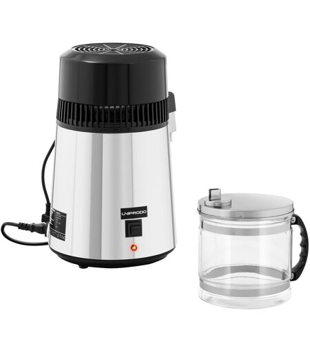 Uniprodon tislauslaitteella UNI-WD-150 suolat, hivenaineet, mikro-organismit, lääkejäämät, kalkki, lyijy ja muut epäpuhtaudet voidaan poistaa luotettavasti vedestä. Tällä tavalla puhdistettu vesi soveltuu erityisen hyvin siivoukseen, koska se imee paremmin likaa poistettujen ainesosien ansiosta ja kalkkitahrojen muodostus voidaan estää. Sähkölaitteiden, kuten silitysraudan, täyttämiseen tulisi käyttää vain tislattua vettä. Viimeisenä mutta ei vähäisimpänä, puhdistettu vesi sopii myös juomiseen - jotkut uskovat sen laihduttavaan vaikutukseen tai paremman kahvin tai teen maun aikaansaamiseen. Se, että tislattu vesi on haitallista, on nyt osoitettu vääräksi tiedoksi; sitä ei kuitenkaan pidä juoda ainoastaan eikä liikaa. Säästä itseltäsi rasittava pullojen kantaminen sekä puhdasta rahaa, mutta älä luovu puhtaasta vedestä! 800 W: n teho ja 4 l:n tilavuus tekevät laitteesta erittäin tehokkaan. Vesitislaus poistaa epäpuhtaudet ja lian luotettavasti jopa 1 litrasta vettä tunnissa. Laadukkaasta ruostumattomasta teräksestä valmistettu sisäseinä takaa parhaat hygieniavaatimukset puhdistusprosessin aikana. Tislattu vesi kerätään tyylikkääseen kannuun, joka on valmistettu lasista. Automaattisen virrankatkaisun ansiosta yli 160 °C:n lämpötilassa tislauslaite toimii aina turvallisesti ja sen käyttöikä on erityisen pitkä. Tämän takaa myös laitteen korkealaatuinen työstö. Valitse vedentislauslaite ja hyödy puhtaudesta ilman haitallisia aineita ja epäpuhtauksia! ...