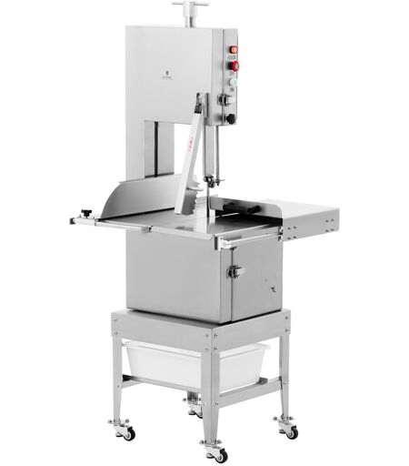 Sähkökäyttöinen luusaha 1 500 W:n moottorilla tarjoaa erinomaista leikkaustehoa ja sopii ihanteellisesti ammattimaiseen lihanjalostukseen suurkeittiöissä ja lihakaupoissa. 2 400 mm pitkä ruostumattomasta teräksestä valmistettu sahanterä leikkaa vaivattomasti tuoreita ja pakastettuja lihoja ja luita nopeudella 15 m/s. Tämän luusahan leikkauskorkeus on enintään 330 mm, joten se soveltuu suurempienkin lihapalojen tehokkaaseen käsittelyyn. Neljä pyörää mahdollistavat mutkattoman liikkuvuuden ja joustavan käytön eri työtiloissa. Jarrut puolestaan pitävät sahan tukevasti paikallaan, kun olet asettanut sen haluamaasi paikkaan. Sahaan integroitu liukujärjestelmä ja 78 x 74 cm:n kokoisessa työtasossa oleva mitta-asteikko takaavat tarkat työtulokset. Käytännöllinen keräysastia mahdollistaa puolestaan leikkuujätteiden nopean ja siistin hävittämisen. Lisäksi tämä sähkökäyttöinen lihasaha täyttää korkeimmat turvallisuusstandardit. Turvakytkin estää sen tahattoman käynnistämisen, kun taas hätäkytkin mahdollistaa nopean sammutuksen. Roiskevesisuojattu ohjausyksikkö toimii turvallisesti myös kosteissa ympäristöissä. Tukeva runko ja ergonominen kahva tekevät sahasta turvallisen ja mukavan käyttää. Laitteen runko ja sahanterä on valmistettu korkealaatuisesta ruostumattomasta teräksestä, joka takaa niiden pitkän käyttöiän ja korroosionkestävyyden – myös vaativissa teollisuusympäristöissä. Luusahan kannet ja hihnapyörä ovat irrotettavia, mikä helpottaa niiden puhdistamista ja huoltoa. Lisäksi se sisältää kätevän kiristysjärjestelmän nopeaa sahanterän vaihtoa varten sekä ilmatiiviit kuulalaakerit, jotka estävät lian ja muiden epäpuhtauksien pääsyn laitteen sisään. ...