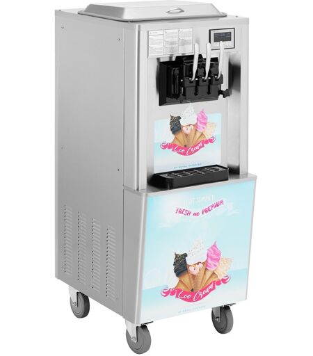 Kesä on tulossa! Varustaudu helteisiin herkullisilla pehmisannoksilla. Royal Cateringin pehmiskone ammattikäyttöön valmistaa pehmistä, sorbettia tai jogurttijäätelöä jopa 33 litraa tunnissa. Suuren 16 litran kokonaistilavuuden ja kompaktin rakenteensa ansiosta tämä pehmiskone ammattikäyttöön sopii erinomaisesti kiireisiin ravintoloihin, jäätelökioskeihin, kahviloihin ja tapahtumapaikoille. Kone vaatii 15 minuutin jäähdytysajan, ennen kuin voit annostella ensimmäiset 6 jäätelöannosta. Sen jälkeen jäähdytysprosessi kestää vain 3 minuuttia. Etsitkö ammattimaista pehmytjäätelökonetta, jolla loihdit nopeasti herkullisia jäätelöannoksia? Sitten olet oikeassa paikassa! Tämän pehmytjäätelökoneen 2 140 W:n teho takaa, että asiakkaasi saavat valmiit jäätelöannokset eteensä hetkessä. Teollisuuslaatuinen moottori varmistaa täyteläisen herkulliset lopputulokset riippumatta siitä, valmistatko laitteella pehmistä, jogurttijäätelöä vai sorbettia. Digitaalisen ohjauspaneelin avulla haluttujen asetusten valitseminen on lastenleikkiä. Käyttöohjeista löydät lisätietoa laitteen eri toiminnoista. Kolme kahden hinnalla! Royal Cateringin pehmytjäätelökoneella voit tarjoilla kahta erimakuista pehmistä. Voit myös sekoittaa ne keskenään, jolloin makuvaihtoehtoja on jopa kolme. Kansi suojaa jäätelöä lialta ja pitää lämpötilan laitteen sisällä vakaana. Lisäksi pehmiskoneen kotelo on valmistettu ruostumattomasta teräksestä. Tämä tekee laitteesta kestävän ja ihanteellisen elintarvikkeiden käsittelyyn. Kone seisoo neljän pyörän päällä, joten voit nopeasti rullata sen haluttuun paikkaan. Lukitse pyörät jarruilla, jolloin pehmis-jäätelökone pysyy tukevasti paikallaan. ...
