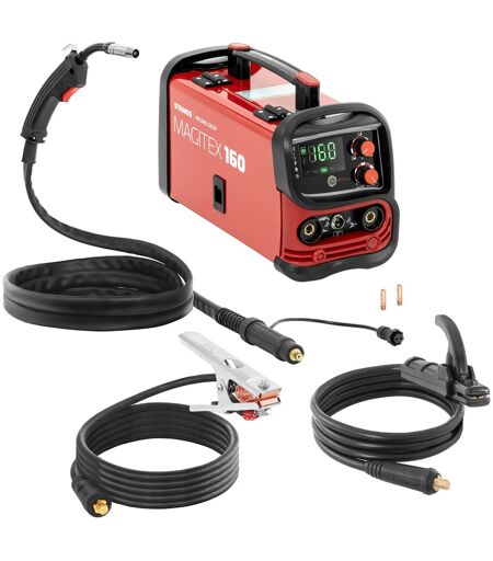 Täytelanka-hitsauskone MAGITEX 160 toimii uusimmalla IGBT-invertteritekniikalla ja tarjoaa maksimaalista joustavuutta ja huippulaatua. Hitsausvirran portaaton säätö aina 130 A:iin asti takaa optimaaliset hitsaussaumat monenlaisissa hitsaustöissä. Täytelankahitsauksen lisäksi kone sopii myös puikkohitsaukseen, minkä ansiosta voit käyttää sitä ongelmitta myös tuulisissa olosuhteissa ulkona. Lisäksi koneessa on myös TIG Liftarc -toiminto. Kirkkaalta ohjauspaneelilta näet aina kaikki hitsausparametrit ja säädät niitä tarpeidesi mukaan. Hitsausmenetelmän valinta toimintojen TIG Liftarc, puikkohitsaus ja Flux välillä sujuu myös aivan yhtä helposti. Täydellä teholla tämä Flux-MIG-hitsauskone saavuttaa hitsausvirran 130 A käyttösuhteella 60 %, joten voit suorittaa sen avulla luotettavasti vaativiakin korjaus- ja kunnostustöitä. Lankakela sijaitsee koneeseen integroidussa kotelossa. Riippuen hitsauslangan halkaisijasta (0,8 / 0,9 / 1 mm), valitse käyttöön sitä vastaava tila ohjauspaneelista, jolloin saavutat optimaaliset hitsaustulokset. Täytelankahitsauskone on suunniteltu kaikenlaisiin metallitöihin niin tuotannossa, työmailla kuin korjaamoissakin. TIG-hitsaus käyttää valokaaren aktivoimiseksi Liftarc-sytytystä. Se ei aiheuta mitään häiriöitä lähistöllä oleville herkille elektronisille laitteille kuten matkapuhelimille, tietokoneille tai ohjauslaitteille. Voit helposti säätää hitsausvirran voimakkuutta jopa 130 A:iin asti ohjauspaneelin kautta. Puikkohitsaus puolestaan sopii ensisijaisesti raudalle tai kuparille ja seosteisille metalleille, kuten valuraudalle tai teräkselle. Koska pinnoitetulla puikolla hitsaamiseen ei tarvita kaasua, laitetta voi käyttää myös vaativissa sääolosuhteissa, kuten kovalla tuulella. Arc Force -toiminto mahdollistaa optimaaliset hitsaustulokset vakaan valokaaren ansiosta. ...