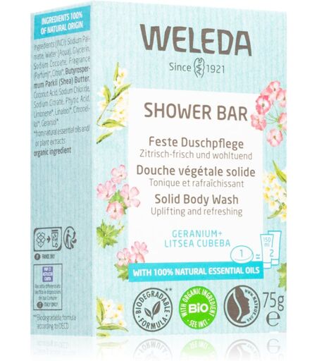 Weleda Shower Bar, 75 g, Palasaippuat Naisille, Palasaippua Weleda Shower Bar on laadukas hygieniatuote. Se pesee ihon tehokkaasti ja poistaa siitä epäpuhtaudet. Ominaisuudet: puhdistaa ihoa hellävaraisesti ravitsee ja kosteuttaa Käyttöohjeet: Levitä saippuaa iholle, vaahdota kevyesti ja hiero hetken. Huuhtele haalealla vedellä. ...
