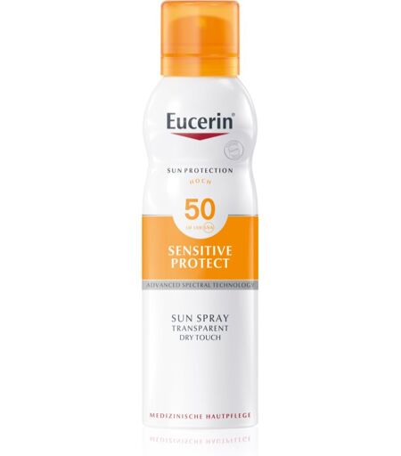Eucerin Sun Sensitive Protect läpinäkyvä aurinkosuojasuihke herkälle iholle SPF 50+ 200 ml