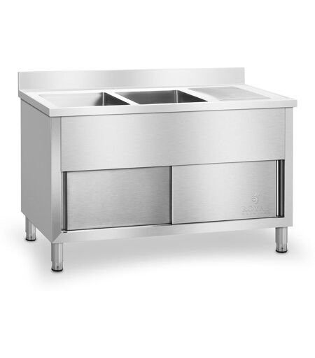 Royal Cateringin allaskaappi RCHS-1400WS on erinomainen elintarvikkeiden pesemiseen, astioiden tiskaamiseen ja kaikenlaisten tarvikkeiden säilyttämiseen. Korkealaatuisesta ruostumattomasta teräksestä valmistettu astiakaappi sopii ravintoloihin, hotelleihin, baareihin, kanttiineihin ja kaikenlaisiin ravintola-alan palveluihin. Kestävän ruostumattoman teräksen ansiosta allaskaappi pysyy pitkään hyvässä kunnossa eikä siihen jää jälkiä liasta tai vedestä. Korkealaatuinen materiaali suojaa biologiselta likaantumisprosessilta ja työskentely on turvallisen hygieenistä. Ruostumattomasta teräksestä valmistettu 26 cm syvä ja mitoitukseltaan 40 kertaa 40 cm kattava allas tarjoaa reilusti tilaa isommillekin astioiolle kuten uunipelleille ja kattiloille. Kaksi henkilöä voi työskennellä kaapin kahden altaan äärellä samanaikaisesti, mikä säästää aikaa ja rahaa. Allaskaapin oikeanpuoleista laskutilaa voi käyttää näppärästi astioiden kuivaamiseen. Allaskaapin puhdistaminen on nopeaa ja helppoa sen materiaalin ansioista. Kahdella käytännöllisellä liukuovella varustettu allaskaappi on helppo sijoittaa ahtaaseenkin keittiöön. Työtarvikkeita voi säilyttää turvallisesti ja hygieenisesti liukuovien takana. Liukuovien avaaminen ja sulkeminen on helppoa, mikä tekee tiskaamisesta ja pesemisestä sujuvaa. Seinän puoleisella reunalla oleva 10 cm korkea ruostumattomasta teräksestä valmistettu roiskesuoja sulkee työtason ja seinän väliin jäävän välin, mistä on höytyä varsinkin seinän ollessa epätasainen. Lisäksi roiskesuoja suojaa seinää vesiroiskeilta ja kosteudelta. Allaskaappiin asetettava siivilä takaa, etteivät ruoantähteet pääse tukkimaan viemäreitä. Siivilän voi pestä helposti lämpimällä tiskivedellä. Pyöristettyjen reunojen ansiosta sen peseminen on myös turvallista. Viemärien sijainti tiskialtaiden keskellä takaa sen, että tiskivesi virtaa hyvin pois altaista. Lisäksi allaskaapin jalkojen korkeutta voi säätää, minkä ansiosta se seisoo vakaasti myös epätasaisilla pinnoilla. Korkeammat jalat helpottavat myös kaapin allaolevan lattian puhtaanapitoa. Allaskaapissa ei ole ennalta sekoitushanojen porausreikiä. Sekoitushanat voidaan sijoittaaa yksilöllisten mieltymysten mukaisesti. Kaapin kokoaminen ja asentaminen on helppoa mukana tulevan ohjeen avulla. Royal Cateringin allaskaappi RCHS-1400WS on tyylikäs ratkaisu monenlaisiin keittiöihin. ...
