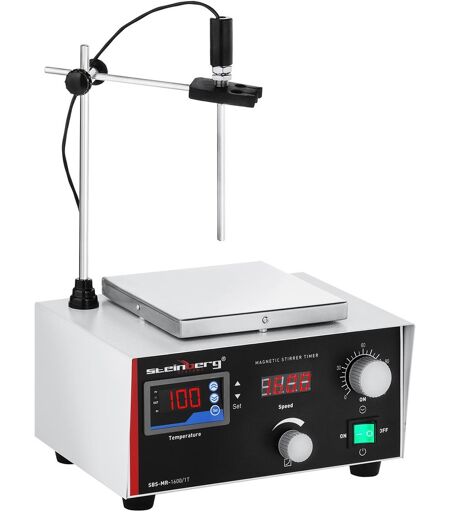 Lämpölevyllisellä magneettisekoittimella SBS-MR-1600/1T voit sekoittaa ja lämmittää erilaisia nesteitä myös suljetuissa astioissa. Laitteen sekoitusalustan sekoitusnopeus ja lämpötila ovat erikseen säädettävissä. Toimituskokonaisuuteen kuuluu kaksi magneettista kuumuutta, hankausta ja kemiallista korroosiota kestävää sekoitussauvaa. Sauvat on helppo puhdistaa ja desinfioida. Steinberg valmistaa laadukkaita laboratoriotuotteita, joita käytetään monilla eri aloilla ja eri yrityksissä. Tätä sekoitinta voi käyttää lääketeollisuudessa, biokemiallisissa yrityksissä, tutkimuslaitoksissa ja monilla muilla alueilla. Nopeuden voi säätää portaattomasti jopa lukemaan 1 600 r/min. Näin voit sekoittaa myös suuren viskositeetin omaavia nesteitä tehokkaasti ja tasaisesti. Tämä laite soveltuu erinomaisesti erityisesti sähkösavukkeiden nesteiden sekoitukseen. Monet e-nesteet ovat yksinkertaisesti liian kalliita. Sekoita itse oma e-nesteesi lempimaullasi, saat juuri sellaisen lopputuloksen kuin haluat ja säästät samalla rahaa! Tässä lämpölevyllisessä magneettisekoittimessa on ajastin, jonka ansiosta sekoitustulokset ovat hyvin tarkkoja. Ajastimen voi säätää välille 0 - 120 minuuttia. Säädetyn ajan kuluttua umpeen sekoitus- ja lämmitystoiminnot kytkeytyvät pois päältä. Sekoitusalustaan kuuluu oma telineensä, lämpötila-anturinsa ja ruostumattomasta teräksestä valmistettu puristimensa. Telineen korkeus ja kallistuskulma ovat säädettävissä. Alustalevyn mitat ovat 16,1 x 16,1 cm. Tälle levylle lasiastiat ja tilavuudeltaan noin viiden litran erlenmeyerpullot mahtuvat vaivatta. Lämpölevy kuumenee nopeasti. Sen lämmitysteho on 250 W ja sekoitusteho 60 W, eli sekoittimen yhteenlaskettu kokonaisteho on 310 W. Valinnaista lämpötila-anturia käyttämällä saat lämpötilan pysymään aina tasaisen tarkkana ilman heilahteluja. Lämpölevyllisessä magneettisekoittimessa on digitaalinen näyttö. Siinä olevan valaistuksen ansiosta näet lukea arvot kauempaakin. Lämpötilan voi säätää välille 5 - 100 ℃. Magneettisekoitin on äärimmäisen hiljainen. Laitteen alapuolella olevat neljä liukumatonta kumitassua vaimentavat tärinää ja pitävät sekoittimen tukevasti ja turvallisesti paikallaan käytön aikana suojaten samalla laitteen alla olevaa pintaa ikäviltä naarmuilta. ...
