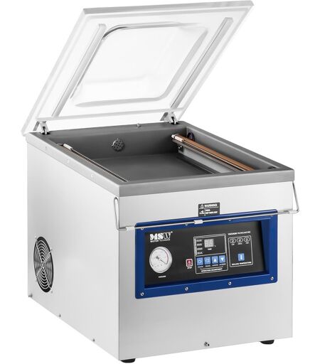 MSW:n MSW-VPM-900K kammiovakuumikone on luotettava kumppani, kun haluat sulkea pakkauksiin tiiviisti ja varmasti elintarvikeita, nesteitä, lääkkeitä ja monia muita tuotteita. 900 watin tehollaan sekä 20 m³/h imutehollaan säilyttää laite tuotteesi pitkään tuoreena ja suojassa ulkoisilta vaikutuksilta. Tämä kompakti kammiovakuumikone sopii täydellisesti vähittäiskauppaan, hotelleihin ja kotikeittiöihin – mutta myös lääkkeiden pakkaamiseen ja laboratorioihin. MSW-VPM-900K kammiovakuumikone mahdollistaa erilaisten tuotteiden pitkäaikaisen säilytyksen ja vähentää samalla pakattavien tavaroiden ja nesteiden tilavuutta, jolloin tilaa säästyy. Vakuumiprosessi toimii vaivattomasti mukana toimitettavien foliopussien ansiosta. Vakuumikammio täytetään ylhäältä käsin ja mahdollistaa 440 x 445 x 65 mm koollaan myös useimpien pienien tuotteiden sulkemisen vakuumiin. Kammion korkeus on 120 mm, jolloin se soveltuu myös suuremmille tuotteille. Täyttämisen jälkeen pussista poistetaan ilma ja foliopussi suljetaan ilmatiiviisti. Vakumointi- ja sinetöintiaikoja voidaan säätää intuitiivisesta digitaalisesta paneelista. Sekä pienten ja ohuiden että myös suurien ja paksujen folioiden sulkeminen onnistuu kolmen eri sinetöintilämpötilan avulla. Laatu, maku ja aromit säilyvät hellävaraisessa vakuumiprosessissa. Samalla pienitiöiden kasvu estetään ja vakuumipakatut tuotteet suojataan kosteudelta ja muilta ulkoisilta tekijöiltä. Tärkeiden asiakirjojen tai lääkkeiden vakumoinnilla takaat turvallisen säilytyksen, joka tapahtuu kaiken lisäksi vielä erittäin tilaa säästävästi. Mukana toimitettavien kirjainten ja lukujen avulla koodaat foliopussit vakuumiprosessin aikana, jolloin pakattujen tavaroiden luettelointi onnistuu selkeästi. Pienen kokonsa ansiosta kammiovakuumikone voidaan asettaa joustavasti haluttuun paikkaan. Vankat kumijalat suojaavat lattiaa naarmuuntumiselta ja niillä kone seisoo tukevasti paikallaan. Vakuumikoneessa on laadukas ja sileä ruostumaton teräspinta, joka on helppo puhdistaa. Huoltoa varten koneen purkaus ja itse huolto onnistuvat yksinkertaisesti toimituksen sisältöön kuuluvien työkalujen ja öljyn avulla. ...