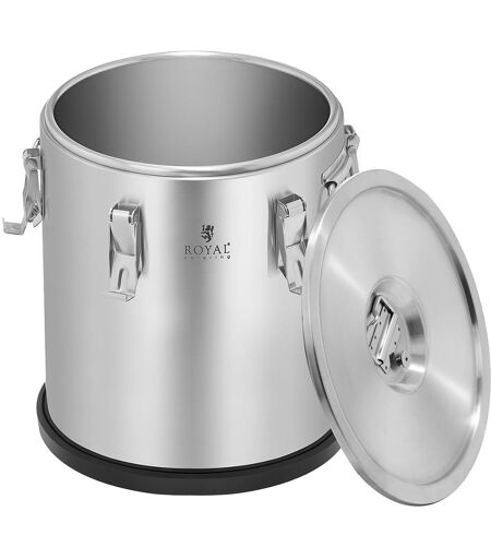 Royal Cateringin RCTP20 lämpöastia takaa niin kuumien kuin kylmienkin ruokien ja juomien varman ja mutkattoman kuljettamisen. Termo-kuljetusastia on suunniteltu erityisesti sekä korkealaatuisille ravintola-alan yrityksille, kuten ravintoloille ja hotelleille että suurkeittiöille tai ruoan kotiinkuljetuspalveluille. Kun arvostat keittiötarvikkeidesi käytännöllisyyttä, säilyvyyttä ja asianmukaista designea on tämä 20 litran tuplaseinällä eristetty termosastia on korvaamaton apu keittiössäsi. RCTP20 astian tilavuus on 20 litraa. Astia ja sen pohja on valmistettu lämmönkestävästä, tuplaseinäisestä ruostumattomasta teräksestä. Kahden ruostumattoman terässeinän välissä on 15 mm paksu lämmöneristyskerros. Tuplaseinä pitää ruuan ja juoman lämpötilan vakaana jopa kuudesta kahdeksaan tuntia. Myös ruostumaton teräskansi on eristetty tuplaseinällä, mikä lisäksi takaa lämpötilan pysymisen vakaana. Kansi on varustettu kuudella helposti avattavalla ja suljettavalla kiinnikkeellä. Kannen kulumaton ja pitkäikäinen silikonitiivisterengas pitää termoastian ilmatiivinä kuljetuksen ajan. Kansi on varustettu tuuletusventtiilillä, josta kuumien ruokien kuljetuksessa aiheutunut höyrynpaine voidaan tasata ennen kannen avaamista. Jotta tuuletusventtiilin käyttö on turvallista, voidaan se avata vain erityisesti muotoillulla kahvalla. Säiliön suu on suuri, jotta säiliön käyttö ja puhdistus olisi mahdollisimman vaivatonta. Lämpöastiassa on kaksi ergonomista kahvaa, jotka helpottavat kuljetusta. Astian pohjassa on joustava muovirengas, joka takaa astian tukevuuden ja paikallaan pysymisen myös liukkailla pinnoilla ja lisäksi suojaa astiaa vaurioilta. Se mahdollistaa myös useamman astian päällekkäin pinoamisen kannen ja muovirenkaan sopiessa täydellisesti sisäkkäin. Ensiluokkainen valmistus harjatusta ruostumattomasta teräksestä tekee RCTP20 astiasta myös erittäin hygieenisen. Astian pinta hylkii ruostetta, vesipisaroita, korroosiotekijöitä ja ruuantähteitä. Ruuat säilyttävät makunsa ja hajunsa alkuperäisenä. Hyvälaatuisen valmistuksen ansiosta termoastia säilyy pitkään hyvässä kunnossa ja on helppo puhdistaa. Tutustuthan myös muihin tuotesarjan lämpöastioihimme. Kaikilla astioilla on sama 30 cm läpimitta, joten yksittäiset 10, 15, 25 ja 35 litran astiat voidaan kätevästi pinota ja yhdistellä keskenään. ...