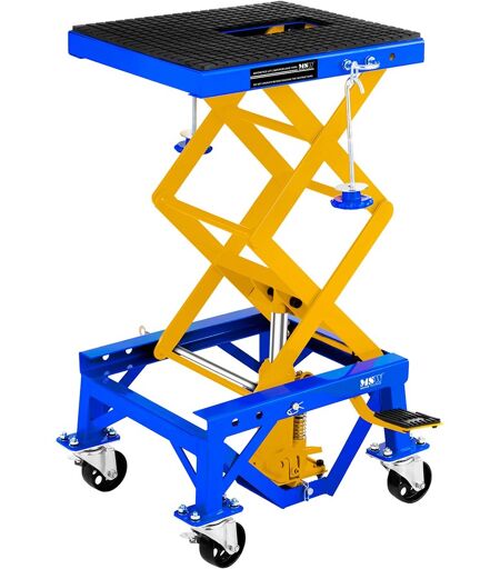 MSW Motor Technics:n MSW-MHB-135-PRO kompakti saksinostin 135 kg kantokyvyllään sopii erityisen hyvin motocrosspyörien, scoottereiden ja Enduro-moottoripyörien korjaukseen ja mahdollistaa pyörän noston korjausta tai huoltoa varten miellyttävälle työkorkeudelle 87 cm maksimikorkeudellaan. Nostolavan kumipäällysteinen 41 x 35 cm taso tarjoaa reilusti tilaa työkalujen säilytykseen kädenulottuvilla. Teräsrakenteen neljässä tukevassa jalassa on kahdella jarrulla varustetut pyörät, jolloin ne takaavat nostimen tukevuuden ja motocrosspyörä voidaan kiinnittää sivuilla olevien u-kiinnikkeiden avulla tukevasti hihnalla nostimeen. Nostohissi nostaa pyörän haluttuun työkorkeuteen. Lavan nosto ja lasku ei vaadi sähköä, koska nostohissi on ohjattavissa helposti jalkapolkimella ja näin saavutetaan haluttu korkeus 35 ja 87 cm väliltä. Lukitustanko takaa nostimen paikallaanpysymisen valitussa korkeudessa. Kierrenupista säätämällä saksinostin voidaan laskea tasaisesti päästämällä ilmaa ulos hissistä. Helppokäyttöisyytensä ja kompaktin rakenteensa vuoksi saksinostimella voidaan nostaa enimmillään 135 kg painoisia kappaleita. Saksinostin toimitetaan yhtenä kappaleena lukuunottamatta nostopoljinta, joka voidaan yksinkertaisesti liittää nostimeen ruuveilla. Hydraulisen nostomekanisminsa ansiosta laitetta voidaan hyvin säilyttää myös matalissa lämpötiloissa. ...