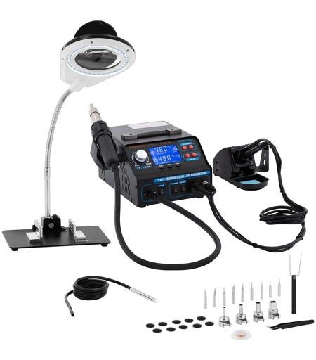 Stamos Solderingin S-LS-6-juotosasema on helppo ja mukava käyttää. Digitaalinen juotosasema suunniteltiin teollisuuden korjaustöihin ja kotiverstaaseen. Pienen kokonsa ja ergonomisen kantokahvan ansiosta juotosasema sopii liikkuvuutta vaativaan työskentelyyn ja on tilaa säästävä. Kaikki Stamos Solderingin juotosasemat ovat ESD-suojattuja. Juotosaseman perusosa toimii virtamittarina ja virtalähteenä ja siitä löytyvät kaikki toivotut toiminnot ja liitännät. Lisäksi laitteessa on suuri LED-näyttö molempien juotoskolvien lämpötilan ilmoitusta varten. Juotosaseman sivulla on myös teline juotoskolville sekä toinen teline puhdistussienellä. 650 watin kuumailmajuotin sopii sekä SMD-osion juottamiseen että juotosten poistoon kuumailmatekniikan avulla. Juotoskolvin lämpövastus takaa tehokkaan lämmönjohtamisen. Toimitukseen kuuluu lisäksi paljon lisävarusteita: suurennuslasivalaisin, 9 juotoskärkeä, 5 kuumailmasuutinta, juotospinsetti kuumien osien käsittelyyn, tinaimunauha juotosten poistamiseen, juotososien pidike sekä tinaimuri materiaalin irroitusta tai asettamista varten. Juotostina on asennettuna laitteeseen vain kuvaa varten. Se ei sisälly toimitukseen. ...