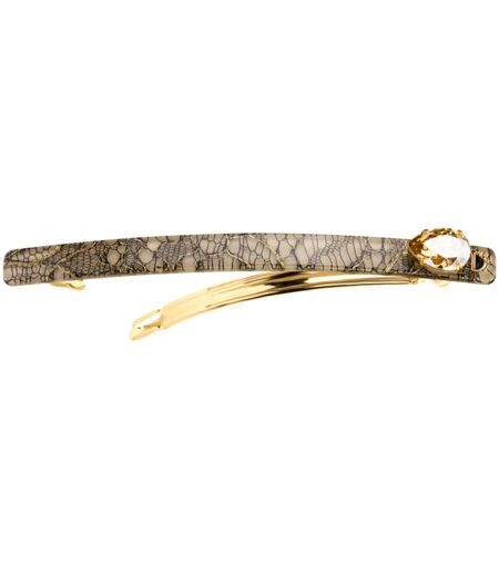 Ylellinen ja kiiltävä hiusklipsi, jossa on erottuva ja huomiota herättävä muotoilu. Yksinoikeutta lisäävät kultainen pitsi ja ihanan kiiltävä Swarovski-kristalli. Viehättävää hiuslisäkettä voi käyttää sekä arkeen että juhlaan. Käsityönä valmistettu biomuovista.Kristalli: SwarovskiVäri: Beige, kultaMetallilukko on kullattuOven lukon koko 11cm. ...