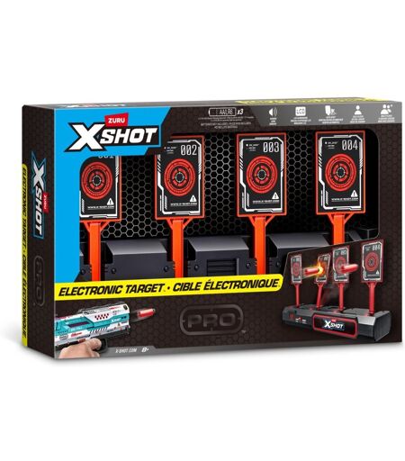 Harjoittele ampumistaitojasi X Shot PRO -sarjan elektronisella maalitaululla. Siinä on neljä maalitaulua, joihin kannattaa osua. Maalit nousevat automaattisesti osumisen jälkeen. Valitse vapaan tulituksen ja aikahyökkäyksen välillä. Pelaa yksin tai moninpelinä. Tikkataulussa on ääni ja LCD-näyttö. Sopii kaikkiin tärkeimpiin tikanheittomerkkien merkkeihin. Pistoolin ja tikanheiton ei ole mukana. Paristot 3 x 1,5 V AA (eivät sisälly) Mitat: noin 89 x 6 x 25 cm. Ikä 8+ Ei alle 3-vuotiaille lapsille. ...
