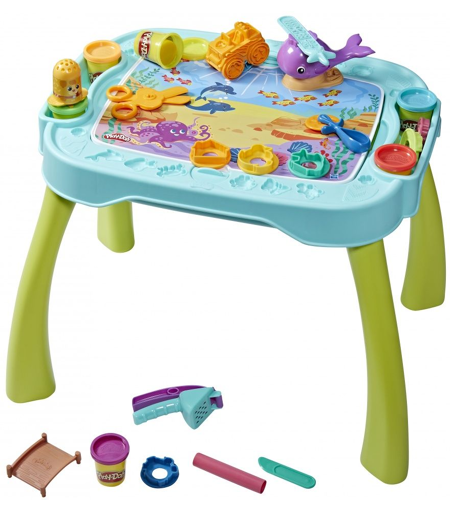 ´Anna lapsille heidän oman leikkialueen fantasian käynnistämiseen All-in-One Creativity Starter Stationilla! Taiteilu ja kädentaidot lasten kanssa tulevat vielä luovemmiksi tämän Play-Doh aktiviteettipöydän kanssa, joka sisältää 15 Play-Doh tarvikkeita ja 6 Play-Doh väriä. Käännä lasten aktiviteettipöytä kahteen tilaan ja löydä monia tutkimusmahdollisuuksia! Tasainen puoli antaa heille mahtavan paikan tutkia luovuuttaan leikkimatolla, kun taas 3D-puoli antaa heidän kuvitella kaikenlaisia seikkailuja vesiputousrakentajan, ajoneuvojen ja eläinten kanssa. Helppo säilytys ja siivous tekevät tästä loistavan lasten lelun, josta myös aikuiset rakastavat. Ennen koulua olevat lelut, kuten tämä aloitus Play-Doh setti, ovat hyviä lahjoja kolmevuotiaille pojille ja tytöille.´ ...