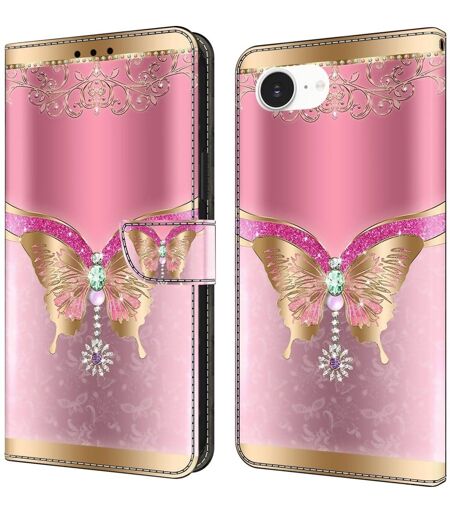 Apple iPhone 16e Kotelo 3D kuvio Vegaaninen nahka lompakko puhelimen kansi jalusta - Pinkki / Kulta Perhonen