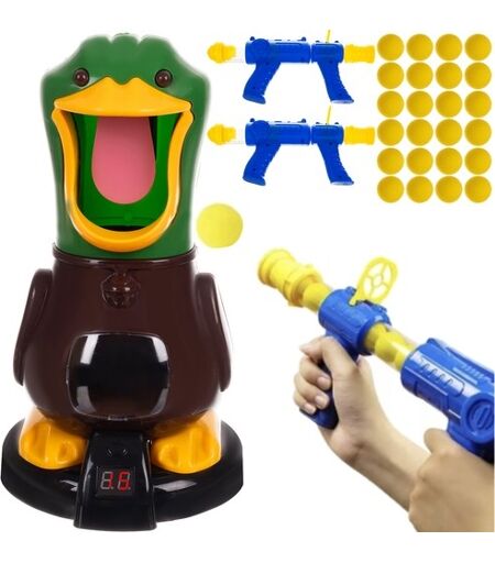 Hungry Duck Target Ammuntapeli Haasta tavoitteesi Hungry Duck Target Shooting Game -pelillä, joka on hauska ja mukaansatempaava tapa lapsille kehittää käsien ja silmän koordinaatiota. Lyö vain ankan kieltä vaahtomuovipallolla ja katso, kuinka se putoaa ankan vatsaan ja lisää pisteen laskuriin. Sarja sisältää kaksi asetta, joiden avulla lapset voivat järjestää ammuntakilpailuja ja oppia voittamisesta ja häviämisestä ystävällisessä kilpailussa. Pelaa ryhmissä tai pareittain ja luo omat säännöt jännityksen lisäämiseksi. Ankassa on suuri LCD-näyttö, joka näyttää tuloksen punaisena. Jokainen onnistunut osuma palkitaan quackilla, joka antaa välitöntä palautetta. Tämä peli on upea lahja kaiken ikäisille lapsille, ja se tuo taatusti hymyjä ja naurua. Tekniset tiedot: - Väri: Monivärinen - Materiaali: Muovi - Mitat: 16 x 29 cm - Akku: 2 x AA (ei sisälly) - Paino: 588 g - Paino pakkauksessa: 700 g Mukana: - 2 asetta - 1 ankka - 24 vaahtopalloa Nollaa peli helposti punaisella painikkeella aloittaaksesi alusta. Täydellinen palloase-harrastajille, tämä arcade-peli lupaa loputtomasti hauskaa. ...