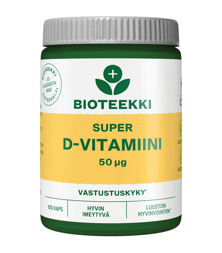 Bioteekki Super D-vitamiini on hyvin imeytyvä, vahva D-vitamiini öljykapselissa. Yksi kapseli sisältää 50 µg D3-vitamiinia oliiviöljyssä. Kapselin sisältämä öljy edistää rasvaliukoisen D-vitamiinin imeytymistä, mistä johtuen D-vitamiinin imeytyminen on tehokasta. Pieni kapseli on helppo nielaista.D-vitamiini edistää immuunijärjestelmän normaalia toimintaa ja sillä on tärkeä rooli vastustuskyvyn tukemisessa. D-vitamiini edistää myös normaalin lihastoiminnan ylläpitämistä sekä luiden ja hampaiden pysymistä normaaleina.Valmiste ei sisällä makeutusaineita, aromeja tai säilöntä- ja väriaineita. Gluteeniton, laktoositon, maidoton, hiivaton ja soijaton. ...