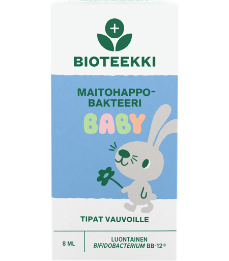 Bioteekki Maitohappobakteeri Baby (entinen BalanticPro Baby) on Suomessa valmistettu maitohappobakteeritippa vastasyntyneille ja vauvaikäisäisille. Bioteekki Maitohappobakteeri Babyn sisältämä Bifidobacterium BB-12 on vauvalle luontainen ja kliinisesti tutkittu maitohappobakteeri. Tipat sisältävät 1 miljardi elävää Bifidobacterium BB-12 -bakteeria / 6 tippaa, ja sopivat päivittäiseen käyttöön tai kuurina vastasyntyneille ja vanhemmille. Annostus kuusi tippaa päivässä, riittoisa 8 ml pakkaus sisältää vähintään 21 päiväannosta. Bioteekki Maitohappobakteeri Baby -tipat säilyvät huoneenlämmössä, avattuna 4 viikkoa. Ravistettava ennen käyttöä. Tuote on gluteeniton, liivatteeton ja soijaton. Tuotesaattaa sisältää jäämiä maidosta. ...