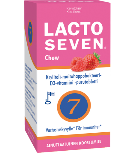 Ksylitolilla makeutettu seitsemän erilaista maitohappobakteeria ja D3-vitamiinia sisältävä purutabletti, joka maistuu koko perheelle. Makuna mansikka-vadelma. ...