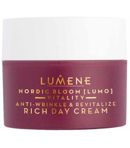 LUMENE Lumo Nordic Bloom Anti-Wrinkle & Revitalize Rich päivävoide ravitsee ikääntynyttä ja kuivaa ihoa koko päivän ja auttaa häivyttämään edenneitä ikääntymisen merkkejä: ryppyjä, sameutta, kuivuutta ja täyteläisyyden vähentymistä. Täyteläinen, pohjoisten marjojen pre-retinolia ja pohjoista maitohorsmaa sisältävä voide kosteuttaa tehokkaasti ja palauttaa ihon sile&aum ...