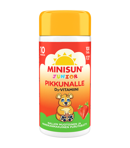Minisun Junior Nalle on helppo tapa turvata lapsen päivittäinen D-vitamiinin saanti. Minisun Junior Nalle on maukkaan mansikan makuinen ja nallen muotoinen tabletti, joka on helppo pureskella, imeskellä tai niellä. Hyvänmakuiset purutabletit sisältävät 10 mikrogrammaa tehokkaasti imeytyvää D3-vitamiinia. D-vitamiini on tarpeellinen lasten luuston ja hampaiden pysymiselle normaaleina. Lisäksi D-vitamiini edistää immuunijärjestelmän normaalia toimintaa lapsilla. Valmisteessa ei ole lisättyjä väriaineita eikä sokeria. Se ei sisällä gluteenipitoisen viljan ainesosia. Minisun D-vitamiini Junior on lisäksi maidoton, laktoositon,liivatteeton ja hiivaton. ...