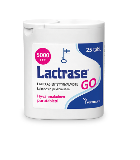 Laktoosinsietokyky vaihtelee yksilöllisesti. Laktaasientsyymi parantaa laktoosin pilkkoutumista henkilöillä, joilla on laktoosin pilkkoutumiseen ja imeytymiseen liittyviä vaikeuksia.Lactrase sisältää Aspergillus oryzae -mikrobin tuottamaa laktaasientsyymiä, joka pilkkoo maitosokerin eli laktoosin tehokkaasti. Kerta-annoksensuuruus riippuu ruuan laktoosipitoisuudesta sekä yksilöllisestä laktoosinsietokyvystä.Suositeltava annos on 1-2 kapselia maitotuotteita sisältävän aterian yhteydessä. Lactrase toimii jo ennen kuin ikäviä vatsatuntemuksia on syntynyt. Siksi se tulee ottaa aterian yhteydessä. Lactrase GO -purutabletit on helppo nauttia ilman vettä. Lactrase sopii kaikille yli 3-vuotiaille ja myös raskaana oleville. ...