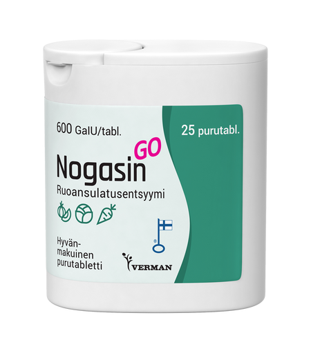 Nogasin on tehokas ja helppokäyttöinen entsyymivalmiste etenkin kasvikunnan tuotteiden kanssa käytettäväksi. Nogasin sisältää luontaista alfagalaktosidaasi–entsyymiä. Se on kätevä ja helppo käyttää niin arkena kuin juhlissakin. Nogasin toimii pilkkomalla ravinnon sulamattomia osia ruuansulatuskanavassa ja sitenestää kaasunmuodostusta. Se auttaa pilkkomaan pitkäketjuisia hiilihydraatteja, joita esiintyy kasviksissa, kuten kaaleissa ja pavuissa, kokojyväviljassa ja pähkinöissä. Nogasin toimii jo ennen kuin ikäviä oireita on syntynyt. Siksi se tulee ottaa aterian yhteydessä.Nogasin GO -purutabletiton helppo nauttia ilman vettä. Nogasinia voidaan antaa yli 3-vuotiaille lapsille. Käytöstä raskauden ja imetyksen aikana kannattaa neuvotella lääkärin kanssa. ...