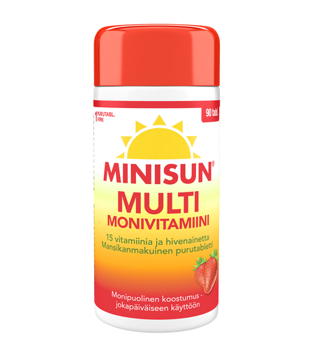 Minisun monivitamiinit ovat helppo tapa turvata päivittäinen vitamiinien ja hivenaineiden saanti ympäri vuoden. Se sisältää 15 vitamiinia ja hivenainetta hyvänmakuisessa purutabletissa. Minisun Monivitamiini Multi Mansikka sisältää erityisesti vastustuskyvylle tärkeitä B-, C- ja D-vitamiineja. Hyvän makuinen purutabletti on helppo pureskella, imeskellä tai niellä ja sopii koko perheelle. Tuote on laktoositon, gluteeniton, soijaton, liivatteeton, hiivaton ja maidoton. ...