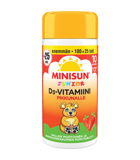 Isompi pakkauskoko! Minisun Junior Nalle on helppo tapa turvata lapsen päivittäinen D-vitamiinin saanti. Minisun Junior Nalle on maukkaan mansikan makuinen ja nallen muotoinen tabletti, joka on helppo pureskella, imeskellä tai niellä. Hyvänmakuiset purutabletit sisältävät 10 mikrogrammaa tehokkaasti imeytyvää D3-vitamiinia. D-vitamiini on tarpeellinen lasten luuston ja hampaiden pysymiselle normaaleina. Lisäksi D-vitamiini edistää immuunijärjestelmän normaalia toimintaa lapsilla. Valmisteessa ei ole lisättyjä väriaineita eikä sokeria. Se ei sisällä gluteenipitoisen viljan ainesosia. Minisun D-vitamiini Junior on lisäksi maidoton, laktoositon,liivatteeton ja hiivaton. ...