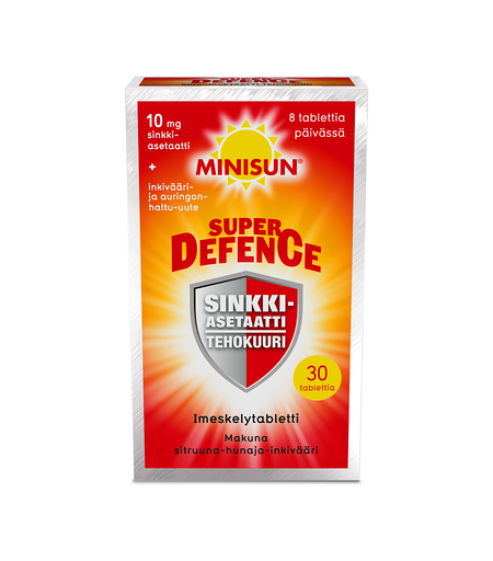 Minisun Super Defence Sinkkiasetaatti on sinkkiasetaattia sisältävä imeskelytabletti, jota käytetään tehokuurina vastustuskyvyn tueksi kolmen päivän ajan. Sinkki edistää immuunijärjestelmän normaalia toimintaa. Sinkin lisäksi tuotteeseen on lisätty inkivääri- ja auringonhattu-uutetta. Yksi tabletti sisältää 10 mg sinkkiä asetaatti muodossa, 5 mg auringonhattu-uutetta ja 1,2 mg inkivääriuutetta. Tuote on hyvänmakuinen, miellyttävä käyttää ja sillä on hyvä suutuntuma. Makuna sitruuna-hunaja-inkivääri. Valmiste on maidoton, laktoositon, soijaton, hiivaton ja gluteeniton. ...